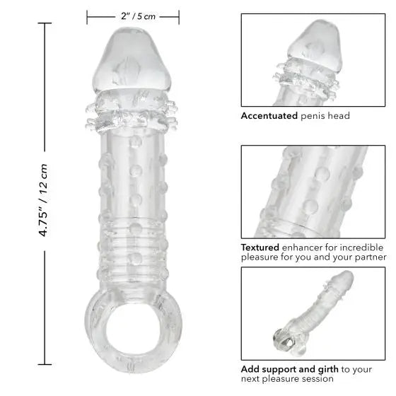 Discover the ultimate male extender, a powerful accessory for intense shared pleasure. With its ribbed chamber and closed tip providing suction, this extender adds 2 inches of length and a stimulating texture that will thrill you. The integrated scrotal bracelet and thick sleeve provide added support and prolong the pleasure for couples. Don't settle for less: our ultra-stretchy extender with scrotal bracelet will have you wanting more.